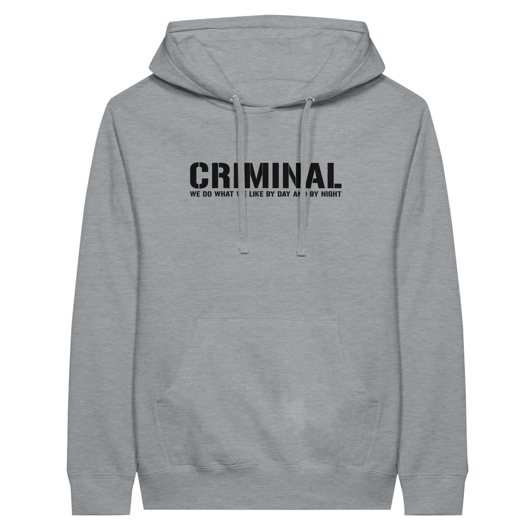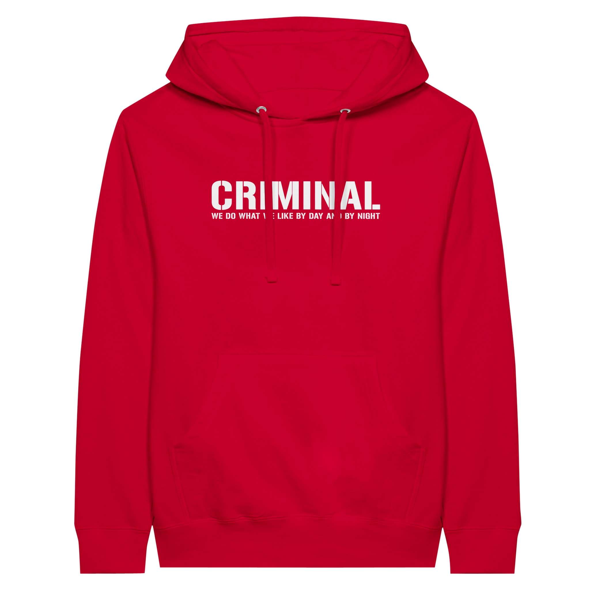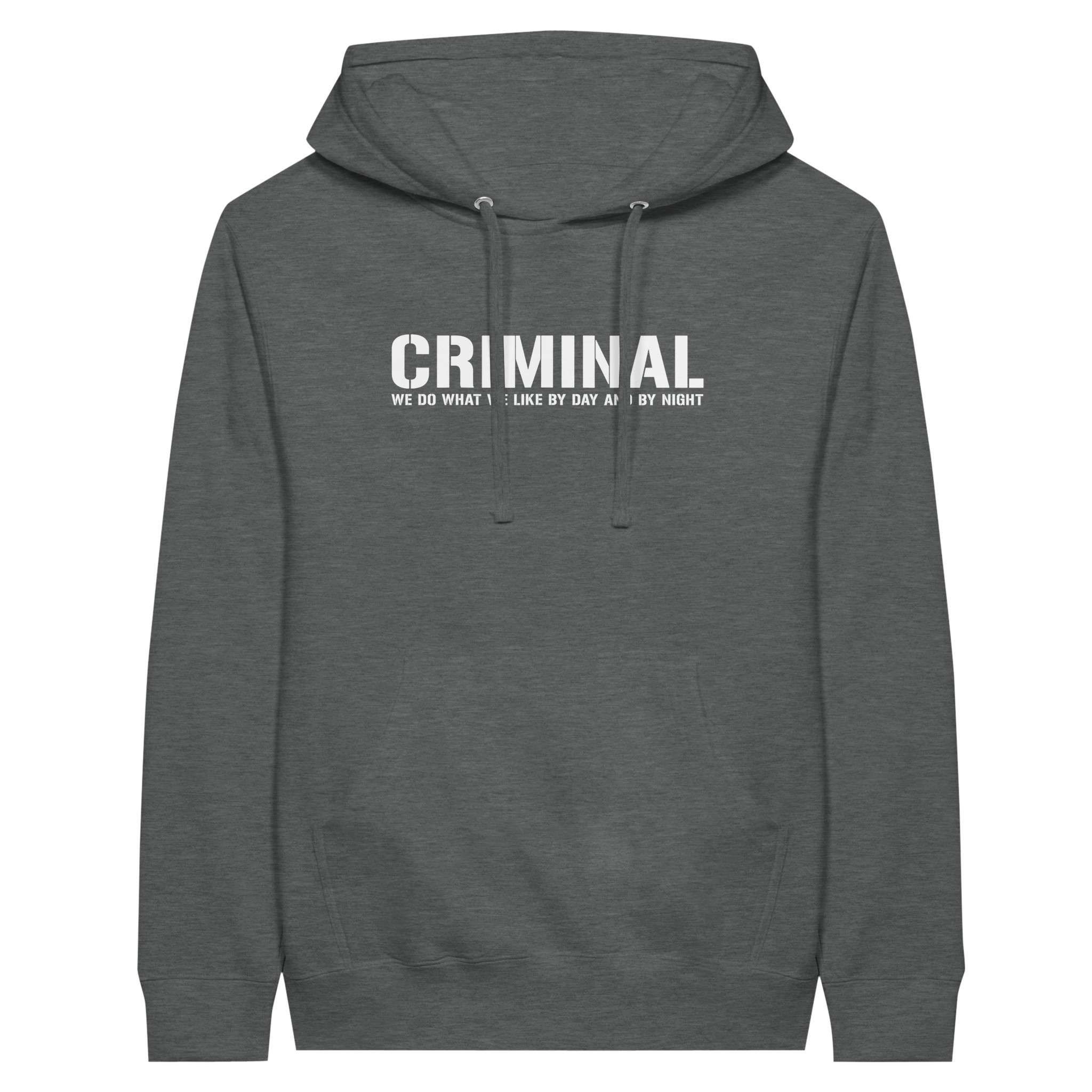 Der „CRIMINAL“-Hoodie ist dein Statement mit urbanem Vibe, hochwertigem Stoff und dem markanten Druck. Die weiche Innenseite trifft auf eine Unisex-Passform, die sitzt wie sie soll – bequem, locker, selbstbewusst.